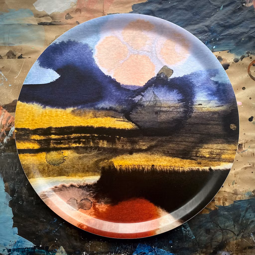 NYHET! Motiv från originalmålning i flytande tusch, inspirerat från naturen hemmavid med naturens växlingar och skiftande färgskala. Brickan passar lika fint som bruksföremål eller som ett vackert blickgång.
